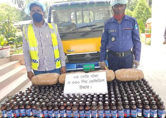 কুষ্টিয়া প্রতিনিধি : কুষ্টিয়ায় পুলিশ ও র্যাবের পৃথক অভিযানে ৩৪৮ বোতল ফেনসিডিল ও ৪ কেজি ৬শ গ্রাম গাঁজা উদ্ধার হয়েছে। এ ঘটনায় আটক হয়েছে ২ জন। বুধবার সকাল সাড়ে ৯টার দিকে কুষ্টিয়ার মিরপুরের মালিহাদ ক্যাম্পের এস আই আবুল কালাম আজাদ ঝুটিয়াডাঙ্গা চেকপোস্টে একটি পিকআপ আটকে তল্লাশি করে ৩৩০ বোতল ফেনসিডিল ও ৪ কেজি গাঁজা উদ্ধার করে। এ সময় পিকআপের চালককে আটক করা হয়। পিকআপটি রাজবাড়ীতে যাচ্ছিল। মাদকসহ পিকআপ আটকের বিষয়ে মিরপুর থানার ওসি আবুল কালাম জানান, পিকআপের চালক, মালিক ও মাদক ব্যবসায়ী ৩ জনের বিরুদ্ধে মামলা দায়েরের প্রস্তুতি চলছে।