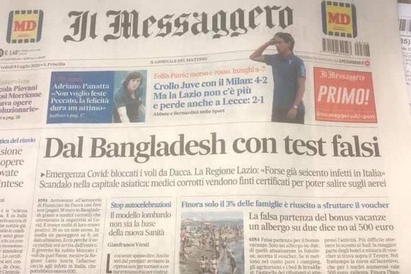 ইতালির শীর্ষ জাতীয় পত্রিকা দৈনিক ইল মেসসাজ্জেরো'র বুধবার প্রধান খবর ছিল, বাংলাদেশ থেকে ভুয়া করোনা সার্টিফিকেট নিয়ে ইতালিতে ফেরত যাওয়াদের নিয়ে।