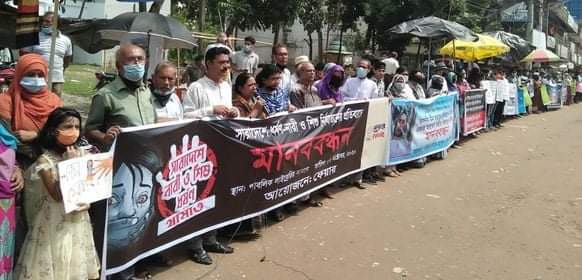 ঘন্টাব্যাপী চলা মানববন্ধনে বিভিন্ন শ্রেণীপেশার বিপুল সংখ্যক মানুষ সংহতি প্রকাশ করে।