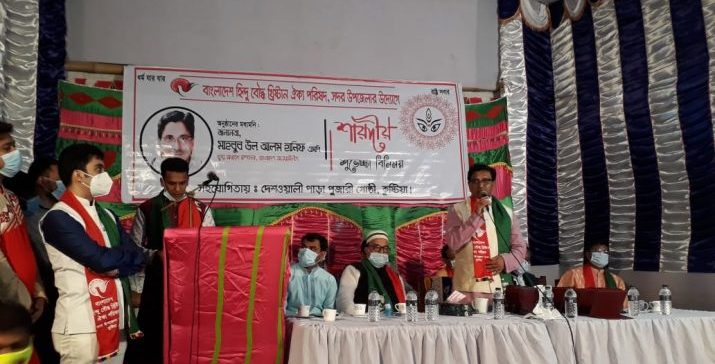 নিজস্ব প্রতিবেদক : ধর্ম যার যার, রাষ্ট্র সবার এই প্রতিপাদ্যকে সামনে রেখে বাংলাদেশ হিন্দু বৌদ্ধ খ্রিষ্টান ঐক্য পরিষদ, কুষ্টিয়া সদর উপজেলার উদ্যোগে শহরের দেশওয়ালী পাড়া পূজারী গোষ্ঠী ও ধোপাপাড়া সার্বজনীন পূজা মন্দিরে শারদীয় শুভেচ্ছা বিনিময় অনুষ্ঠানে প্রধান অতিথি হিসাবে উপস্থিত ছিলেন বাংলাদেশ আওয়ামীলীগের যুগ্ম-সাধারণ সম্পাদক মাহাবুবউল আলম হানিফ এমপি। কুষ্টিয়া সদর উপজেলার বাংলাদেশ হিন্দু বৌদ্ধ খ্রিষ্টান ঐক্য পরিষদের সভাপতি ব্যারিষ্টার গৌরব চাকী’র সভাপতিত্বে ও সাধারন সম্পাদক কিশোর কুমার ঘোষ জগত এর সার্বিক পরিচালনায় ২৪ অক্টোবর শনিবার বিকেলে দুর্গা পূজা মন্দিরে শুভেচ্ছা বিনিময় অনুষ্ঠানে, বিশেষ অতিথি ছিলেন, কুষ্টিয়া জেলা আওয়ামীলীগের সভাপতি আলহাজ্ব সদর উদ্দিন খান, সাধারণ সম্পাদক আজগর আলী, সদর উপজেলা নির্বাহী অফিসার জুবায়ের হোসেন চৌধুরী, শহর আওয়ামীলীগের সভাপতি তাইজাল আলী খাঁন, সাধারন সম্পাদক ও সদর উপজেলা পরিষদের চেয়ারম্যান আতাউর রহমান আতা, জেলা আওয়ামীলীগের সাবেক যুগ্ম সাধারন সম্পাদক প্রোকৌঃ ফারুকউজ্জামান, সাংগঠনিক সম্পাদক শেখ হাসান মেহেদী, শিক্ষা বিষয়ক সম্পাদক আমজাদ হোসেন রাজু সহ দলীয় অঙ্গ সংগঠনের নেতৃবৃন্দ। অনুষ্ঠানে সার্বিক ভাবে সহযোগিতা করেছেন কুষ্টিয়া জেলা ছাত্র ঐক্য পরিষদের আহবায়ক পরিতশ দাস, সদস্য সচিব ও শহর স্বেচ্ছাসেবকলীগের যুগ্ম আহবায়ক মানব চাকী সহ ছাত্র ঐক্য পরিষদের নেতাকর্মী। প্রধান অতিথি বলেন, দূর্গা পূজা বাঙালির উৎস, যা প্রতিবছর জাঁকজমকপূর্ণ ভাবে বাঙালিরা পালন করে থাকে। কিন্তু এবছরে ধুমধাম করে পালন করা সম্ভব হচ্ছে না, দেশে মহামারী করোনা ভাইরাসের জন্য। ঢাকের তাল দিয়ে পূরো বাংলাতে দূর্গা পূজার হাওয়া বইতে থাকে। এ বছরে যারা যার অবস্থান থেকে পূজা উৎযাবন করলে মহামারী করোনা থেকে মুক্তি পাওয়া যাবে। তিনি আরো বলেন, সকলে মিলেমিশে চলতে হবে, খন্ড খন্ড ভাবে আলাদা জায়গায় মন্দির বা পূজা না করে এক সাথে পূজা করলে আনন্দটা বেশী হয়। এক সাথে সবাই মিলেমিশে থাকার যে আনন্দ বা তৃপ্তি আছে সেটা একাকিত্ব থাকার মধ্যে নেই। পূজা উৎসবকে কেন্দ্র করে কোন প্রকার বিশৃঙ্খলা করা যাবে না। ধর্ম যার যার উৎসব সবার।