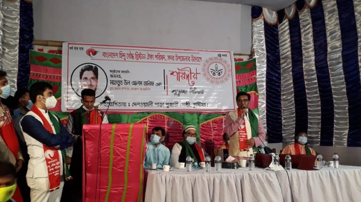 নিজস্ব প্রতিবেদক : ধর্ম যার যার, রাষ্ট্র সবার এই প্রতিপাদ্যকে সামনে রেখে বাংলাদেশ হিন্দু বৌদ্ধ খ্রিষ্টান ঐক্য পরিষদ, কুষ্টিয়া সদর উপজেলার উদ্যোগে শহরের দেশওয়ালী পাড়া পূজারী গোষ্ঠী ও ধোপাপাড়া সার্বজনীন পূজা মন্দিরে শারদীয় শুভেচ্ছা বিনিময় অনুষ্ঠানে প্রধান অতিথি হিসাবে উপস্থিত ছিলেন বাংলাদেশ আওয়ামীলীগের যুগ্ম-সাধারণ সম্পাদক মাহাবুবউল আলম হানিফ এমপি। কুষ্টিয়া সদর উপজেলার বাংলাদেশ হিন্দু বৌদ্ধ খ্রিষ্টান ঐক্য পরিষদের সভাপতি ব্যারিষ্টার গৌরব চাকী’র সভাপতিত্বে ও সাধারন সম্পাদক কিশোর কুমার ঘোষ জগত এর সার্বিক পরিচালনায় ২৪ অক্টোবর শনিবার বিকেলে দুর্গা পূজা মন্দিরে শুভেচ্ছা বিনিময় অনুষ্ঠানে, বিশেষ অতিথি ছিলেন, কুষ্টিয়া জেলা আওয়ামীলীগের সভাপতি আলহাজ্ব সদর উদ্দিন খান, সাধারণ সম্পাদক আজগর আলী, সদর উপজেলা নির্বাহী অফিসার জুবায়ের হোসেন চৌধুরী, শহর আওয়ামীলীগের সভাপতি তাইজাল আলী খাঁন, সাধারন সম্পাদক ও সদর উপজেলা পরিষদের চেয়ারম্যান আতাউর রহমান আতা, জেলা আওয়ামীলীগের সাবেক যুগ্ম সাধারন সম্পাদক প্রোকৌঃ ফারুকউজ্জামান, সাংগঠনিক সম্পাদক শেখ হাসান মেহেদী, শিক্ষা বিষয়ক সম্পাদক আমজাদ হোসেন রাজু সহ দলীয় অঙ্গ সংগঠনের নেতৃবৃন্দ। অনুষ্ঠানে সার্বিক ভাবে সহযোগিতা করেছেন কুষ্টিয়া জেলা ছাত্র ঐক্য পরিষদের আহবায়ক পরিতশ দাস, সদস্য সচিব ও শহর স্বেচ্ছাসেবকলীগের যুগ্ম আহবায়ক মানব চাকী সহ ছাত্র ঐক্য পরিষদের নেতাকর্মী। প্রধান অতিথি বলেন, দূর্গা পূজা বাঙালির উৎস, যা প্রতিবছর জাঁকজমকপূর্ণ ভাবে বাঙালিরা পালন করে থাকে। কিন্তু এবছরে ধুমধাম করে পালন করা সম্ভব হচ্ছে না, দেশে মহামারী করোনা ভাইরাসের জন্য। ঢাকের তাল দিয়ে পূরো বাংলাতে দূর্গা পূজার হাওয়া বইতে থাকে। এ বছরে যারা যার অবস্থান থেকে পূজা উৎযাবন করলে মহামারী করোনা থেকে মুক্তি পাওয়া যাবে। তিনি আরো বলেন, সকলে মিলেমিশে চলতে হবে, খন্ড খন্ড ভাবে আলাদা জায়গায় মন্দির বা পূজা না করে এক সাথে পূজা করলে আনন্দটা বেশী হয়। এক সাথে সবাই মিলেমিশে থাকার যে আনন্দ বা তৃপ্তি আছে সেটা একাকিত্ব থাকার মধ্যে নেই। পূজা উৎসবকে কেন্দ্র করে কোন প্রকার বিশৃঙ্খলা করা যাবে না। ধর্ম যার যার উৎসব সবার।