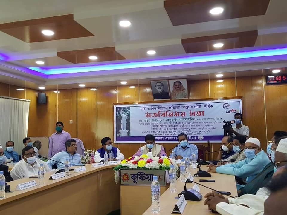 কুষ্টিয়া প্রতিনিধি : কুষ্টিয়ায় নারী ও শিশু নির্যাতন প্রতিরোধ কল্পে করনীয় শীর্ষক মতবিনিময় সভা আজ অনুষ্ঠিত হয়েছে । অনুষ্ঠানে সাম্প্রতিক সময়ে ঘটে যাওয়া অপ্রীতিকর ধর্ষণের কিছু ঘটনার কথা উল্লেখ করে এ সকল ঘটনা প্রতিরোধে জনসচেতনতা বৃদ্ধি, প্রশাসনিক তৎপরতা ও আইনের সঠিক ব্যবহারে যোর দেওয়ার জন্য বলা হয়।
