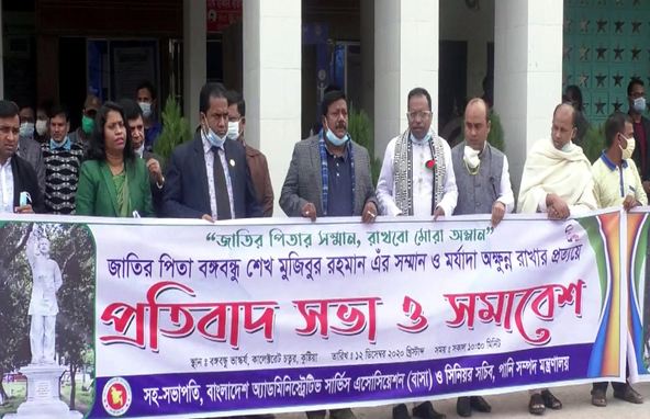 আজ শনিবার সকাল ১০ টায় কুষ্টিয়া জেলা প্রশাসকের কার্যালয়ে বঙ্গবন্ধুর ম্যূরালের সামনে এই প্রতিবাদ সভা ও সমাবেশ অনুষ্ঠিত হয়। এ সময় উপস্থিত ছিলেন পানিসম্পদ মন্ত্রনালয়ের সচিব কবীর বিন আনোয়ার,জেলা প্রশাসক মো.আসলাম হোসেন, জেলা ও দায়রা জজ অরূপ কুমার গোস্বামী,পুলিশ সুপার এস এম তানভীর আরাফাত,গণপূর্ত বিভাগের নির্বাহী প্রকৌশলী আরিফুর ইসলামসহ সকল কর্মকর্তা-কর্মচারীবৃন্দ।