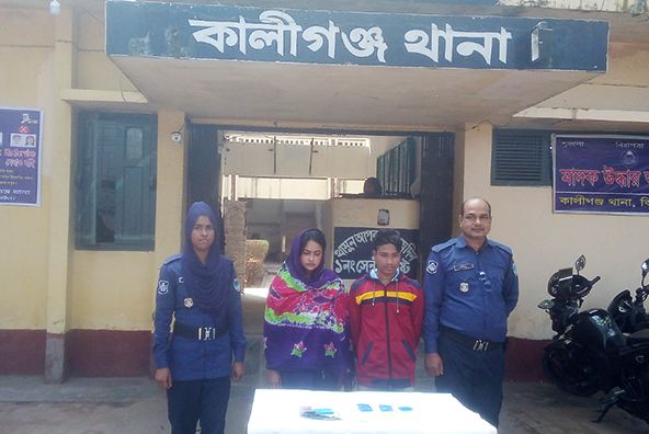 আটককৃতরা হলেন- লাইজু খাতুন (২৪) ও সাইফুল ইসলাম (১৯)। এর মধ্যে লাইজু খাতুন কালীগঞ্জ আড়পাড়া মাঠ পাড়া গ্রামের আ. মাজেদের স্ত্রী ও সাইফুল ইসলাম ভোলা জেলার শশিভূষণ থানার জাহানপুর গ্রামের আব্দুল খালেকের ছেলে।