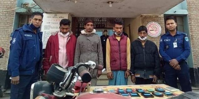 কুষ্টিয়ায় চোরায়কৃত মোটর সাইকেল ও মোবাইল ফোনসহ চোর সদস্যের চারজনকে আটক করেছে পুলিশ। জেলা পুলিশ সুপার এস.এম তানভীর আরাফাত এর নির্দেশনা তদন্ত মামুন অর রশিদের নেতৃত্বে পুলিশের বিশেষ অভিযানে শহরের বিভিন্ন জায়গাতে থেকে তাদেরকে আটক করেন। আটকের পর তাদের স্বীকারোক্তি মূলে তাদের হেফাজতে থাকা একটি ১০০সিসির মোটর সাইকেল ও ১৫টি মোবাইল সেট উদ্ধার করেন। সোমবার (২১ ডিসেম্বর) বিকালে কুষ্টিয়া মডেল থানার প্রাঙ্গনে অতিরিক্ত পুলিশ সুপার আতিকুল ইসলাম তিনি প্রেস কনফারেন্সের মাধ্যমে সাংবাদিকদেরকে জানান। আটকৃত হচ্ছে মোল্লাতেঘরিয়া এলাকার রওশন আলীর ছেলে মিলন, কুমারখালী থানার সাওতা উত্তরপাড়া গ্রামের লুৎফর রহমানের ছেলে মেহেদী হাসান, হররা কামারপাড়া এলাকার জয়নাল শেখের ছেলে সজিব শেখ ও চৌড়হাস এলাকার আনারুল ইসলামের ছেলে নুর ইসলাম। এ সময় অতিরিক্ত পুলিশ আতিকুল ইসলাম বলেন, কয়েকদিন আগে কুষ্টিয়া মডেল থানায় একটি মোটর সাইকেল চুরি মামলা দায়ের হয়। এরই ধারাবাহিকতায় তদন্ত করতে গেয়ে এই চোর চক্রের সন্ধান পাই। তাদেরকে জিজ্ঞাসাবাদ মোতাবেক একটি মোটর সাইকেল ও ১৪টি মোবাইল ফোন উদ্ধার করি।