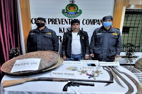 কুষ্টিয়া প্রতিনিধি : র্যাব—১২, সিপিসি—১, কুষ্টিয়া ক্যাম্পের একটি বিশেষ চৌকষ আভিযানিক দল অদ্য ২৭ ডিসেম্বর ২০২০ ইং তারিখ রাত ২১.১০ ঘটিকা হতে ২২.১০ ঘটিকার সময় ‘‘কুষ্টিয়া জেলার সদর থানাধীন ভবানী পুর বাজারস্থ জনৈক সাদ্দামের চায়ের দোকানের সামনে পাঁকা রাস্তার উপর’’ একটি বিশেষ অভিযান পরিচালনা করে। উক্ত অভিযানে চরমপন্থী সংগঠন গনমুক্তি ফৌজের সামরিক শাখার প্রধান শীর্ষ সস্ত্রাসী আমিনুল ইসলাম মুকুলে সহযোগী ও আঞ্চলিক কমান্ডার ও বর্তমানে ভাবনীপুর এলাকার ত্রাস রশিদুল ইসলাম (৪২)’কে ০১। লোহার দেশীয় তৈরী শুটার গান—০১টি ও একনালা বুন্দুক—০১টি, ২। কাতুর্জ গুলি—১৭ রাউন্ড, ৩। হাসুয়া—০৪টি, ৪। বেতের তৈরী ঢাল—০৪, ৫। মোবাইল ফোন—০২টি, ৬। সীমকার্ড—০৪টি, ৭। নগদ টাকা ১২২৭/— টাকা সহ ০১ জন আসামী মোঃ রাশিদুল ইসলাম (৪২), পিতা—মৃত তোরাব আলী শেখ, সাং—ভবানীপুর উত্তর পাড়া, থানা—সদর, জেলা—কুষ্টিয়া’কে গ্রেফতার করা হয়। পরবর্তীতে উদ্ধারকৃত আলামতসহ ধৃত আসামীর বিরুদ্ধে কুষ্টিয়া জেলার সদর থানায় একটি অস্ত্র মামলা দায়ের করা হয়েছে এবং গ্রেফতারকৃত আসামী’কে কুষ্টিয়া জেলার সদর থানায় সোপর্দ করা হয়েছে। উল্লেখ্য যে, চরমপন্থী সংগঠন গনমুক্তি ফৌজের সামরিক শাখার প্রধান শীর্ষ সস্ত্রাসী আমিনুল ইসলাম মুকুলের আঞ্চলিক কমান্ডার। সে সস্ত্রাসী মুকুলের নেতৃত্বে এলাকায় হত্যা, গুম, চাঁদাবাজি, অপহরণ, টেন্ডারবাজী ও নারী লুষ্ঠন সহ বিভিন্ন ধরণে অপকর্ম পরিচালনা করে এবং তার বিরুদ্ধে ০৫টি মামলা ও ০১টি সাধারাণ ডাইরি রয়েছে। এই বিষয়ে র্যাব—১২, সিপিসি—১, কুষ্টিয়া ক্যাম্পের কোম্পানী কমান্ডার মেজর গাফ্ফারুজ্জামন বলেন চাঁদাবাজি, হত্যা, গুম, অপহরণ, টেন্ডারবাজী, মদক, কিশোর গ্যাং ও নারী লুষ্ঠন সহ সকল প্রকার অপরাধের মূল শেকড় উপড়ে ফেলা হবে। তিনি আরো বলেন এই ধরণের অভিযান সচল রেখে চাঁদাবাজি, হত্যা, গুম, অপহরণ, টেন্ডারবাজী, মদক, কিশোর গ্যাং ও মাদকমুক্ত সোনার বাংলা গঠনে র্যাব—১২, সিপিসি—১, কুষ্টিয়া বদ্ধপরিকর।