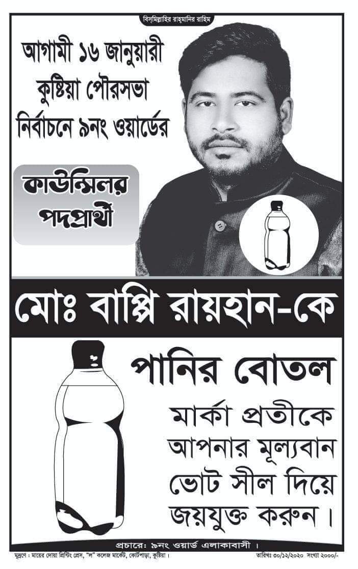 মো: বাপ্পি রায়হান বলেন ,কুষ্টিয়া পৌরসভা ৯ নং ওয়ার্ডে আমি ,পানির বোতল প্রতীকে কাউন্সিলর পদে জয়যুক্ত হতে পারলে,আমি এলাকার উন্নয়ন,মাদকমুক্ত,সন্ত্রসীমুক্ত,দূনীতিমূক্ত,গরীব অসহায় মানুষের সকল সমস্যায় পাশে দাড়ানোর ওয়াদা করছি এবং সকলের সুখে-দুঃখে পাশে থাকবো ইন্স-আল্লাহ ।
