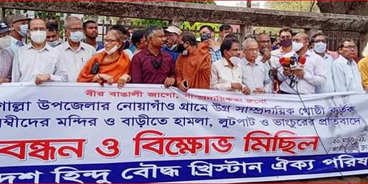 বক্তারা বলেন, ফেসবুকে ধর্ম অবমাননা ও ধর্মীয় অনুভূতিতে আঘাতের মিথ্যা ও বানোয়াট অভিযোগ এনে কক্সবাজারের রামু, পাবনার সাঁথিয়া, রংপুরের গঙ্গাচড়া, কুমিল্লার হোমনা, ব্রাহ্মণবাড়িয়ার নাসিরনগর, ভোলার বোরহানউদ্দিন, মুরাদনগরের কোরবানপুর এবং গত ১৭ মার্চ সুনামগঞ্জের শাল্লায় ধর্মীয় সংখ্যালঘুদের ওপর নির্যাতন চালানো হয়েছে।
