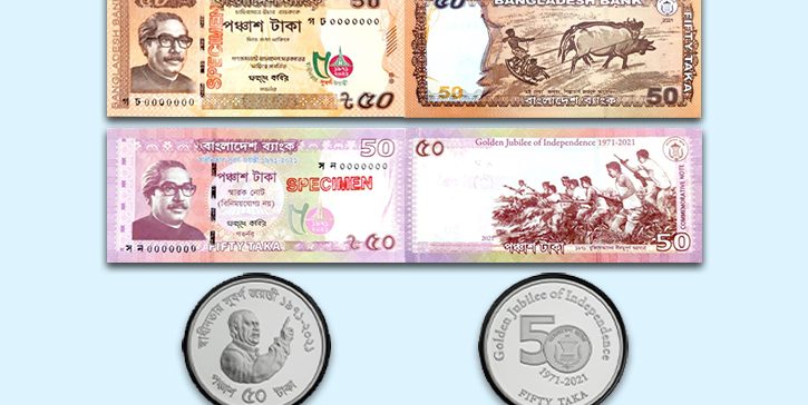 বাংলাদেশের ‘স্বাধীনতার সুবর্ণ জয়ন্তী’ উদযাপন উপলক্ষে ৫০ টাকা মূল্যমানের প্রচলনযোগ্য স্মারক ব্যাংক নোট, ৫০ টাকা মূল্যমানের স্মারক নোট ও ৫০ টাকা মূল্যমানের রৌপ্য স্মারক মুদ্রা মুদ্রণ করেছে বাংলাদেশ ব্যাংক।