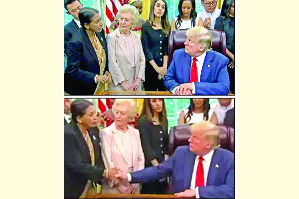 ধর্মীয় নিপীড়নের শিকার হওয়া বিশ্বের বিভিন্ন দেশের ২৭ জন নারী-পুরুষ মার্কিন প্রেসিডেন্ট ডোনাল্ড ট্রাম্পের সঙ্গে সাক্ষাৎ করেছেন। সংখ্যালঘুদের বিপদে পাশে দাঁড়ানোর জন্য তারা ট্রাম্পের কাছে কৃতজ্ঞতা জানান। একই সঙ্গে পেশ করেন নিজেদের অভাব-অভিযোগ। এ সময় নিজেকে বাংলাদেশি পরিচয় দিয়ে প্রিয়া সাহা নামে এক নারী ট্রাম্পকে জানিয়েছেন, এখানে প্রায় ৩ কোটি ৭০ লাখ হিন্দু, বৌদ্ধ, খ্রিস্টান নিখোঁজ রয়েছেন। বাংলাদেশে তার ঘরবাড়ি পুড়িয়ে দেওয়া হয়েছে। জমি ছিনিয়ে নেওয়া হয়েছে। তবু তিনি আইনের সুরক্ষা পাননি। ট্রাম্পের কাছে অভিযোগের এই ভিডিও সামাজিক যোগাযোগমাধ্যমে ছড়িয়ে পড়ার পর চলছে তীব্র সমালোচনা। ভিডিওতে দেখা যায়, গত বুধবার বিভিন্ন দেশের ধর্মের নামে নিপীড়িত হওয়া ব্যক্তিদের সঙ্গে নিজের ওভাল অফিসে দেখা করেছেন মার্কিন প্রেসিডেন্ট ডোনাল্ড ট্রাম্প। এ সময় সেখানে এক নারী নিজেকে বাংলাদেশি পরিচয় দিয়ে ট্রাম্পকে বলেন, ‘স্যার, আমি বাংলাদেশ থেকে এসেছি। এখানে প্রায় ৩ কোটি ৭০ লাখ হিন্দু, বৌদ্ধ, খ্রিস্টান নিখোঁজ রয়েছেন। দয়া করে আমাদের সাহায্য করুন। আমরা আমাদের দেশেই থাকতে চাই।’ এ সময় ডোনাল্ড ট্রাম্প তার দিকে হাত বাড়িয়ে দেন। ট্রাম্পের হাতে হাত রেখে তিনি বলেন, ‘এখনো সেখানে ১ কোটি ৮০ লাখ সংখ্যালঘু রয়েছে। দয়া করে আমাদের সাহায্য করুন। আমরা আমাদের দেশ ছাড়তে চাই না। সেখানে আমি আমার ঘরবাড়ি হারিয়েছি। তারা আমার ঘরবাড়ি জ্বালিয়ে দিয়েছে। তারা আমার জমিজমাও দখল করে নিয়েছে। কিন্তু এর কোনো বিচার হয়নি।’ ওই নারীর বক্তব্যের পর ট্রাম্প বলেন, ‘কারা জমি দখল করেছে, কারা ঘরবাড়ি দখল করেছে?’ তখন একটু ভেবে ওই নারী বলেন, ‘মুসলিম মৌলবাদী সংগঠন। তারা সব সময় রাজনৈতিক আশ্রয় পায়। সব সময়।’ এ বক্তব্য সামাজিক গণমাধ্যমে ছড়িয়ে পড়ার পর তীব্র ক্ষোভের সৃষ্টি হয়। সবাই তীব্র সমালোচনা করে দাবি করেন, দেশে ফেরার পর এই নারীকে আটক করে জিজ্ঞাসাবাদ করা প্রয়োজন। কোথা থেকে তিনি এই আজব তথ্য পেয়েছেন? যদি সত্য না হয় তাহলে কী কারণে তিনি বিশ্বের সামনে বাংলাদেশের নামে এমন মিথ্যাচার করলেন। শুধু তাই নয়, তার পরিচয়ও সামাজিক গণমাধ্যমে উঠে আসে। জানা যায়, ওই নারীর নাম প্রিয়া সাহা। তিনি বাংলাদেশ হিন্দু-বৌদ্ধ-খ্রিস্টান ঐক্য পরিষদের সহযোগী সংগঠন বাংলাদেশ মহিলা ঐক্য পরিষদের সাবেক সাধারণ সম্পাদক। তার স্বামীর নাম মলয় সাহা। তিনি দুর্নীতি দমন কমিশনের উপপরিচালক হিসেবে কর্মরত রয়েছেন। প্রিয়া সাহার বাড়ি পিরোজপুরে। তিনি সামাজিক যোগাযোগমাধ্যমে সব সময় সাম্প্রদায়িক উসকানিমূলক লেখালেখি করেন। নাজিরপুর উপজেলার চরবানিরীর মাটিভাঙায় তার গ্রামের বাড়ি। স্থানীয় একজন আওয়াম