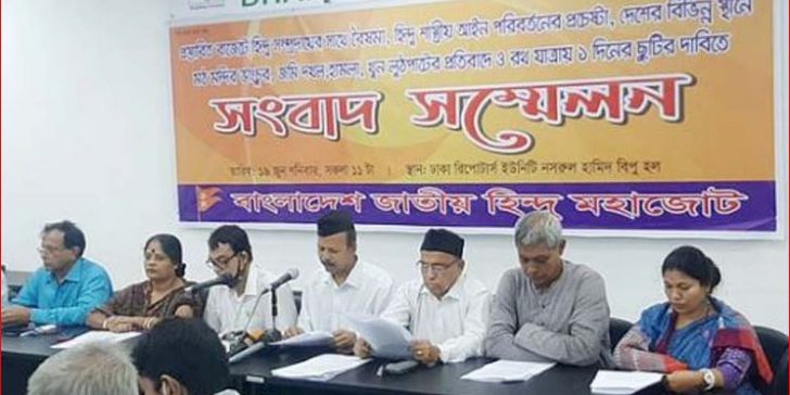 শনিবার দুপুরে ঢাকা রিপোটার্স ইউনিটির নসরুল হামিদ হলে আয়োজিত এক সংবাদ সম্মেলনে এ দাবি করে সংগঠনটি। সংবাদ সম্মেলনে লিখিত বক্তব্য পড়ে শোনান বাংলাদেশ জাতীয় হিন্দু মহাজোটের মহাসচিব গোবিন্দ চন্দ্র প্রামাণিক।