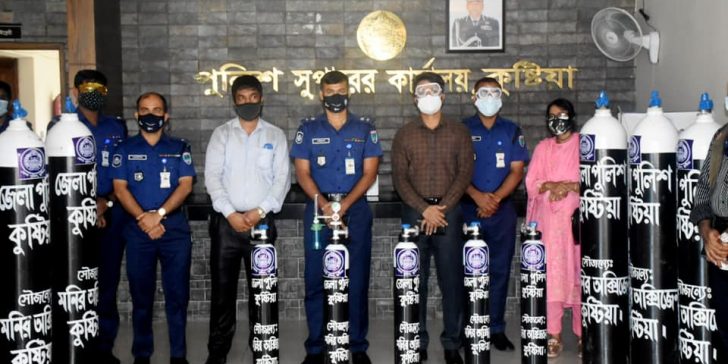 ১০টি অক্সিজেন ভর্তি সিলিন্ডার,ফ্লোমিটার ও অক্সিমিটার দিলেন মনির অক্সিজেন লিঃ জেলা পুলিশ কুষ্টিয়াকে