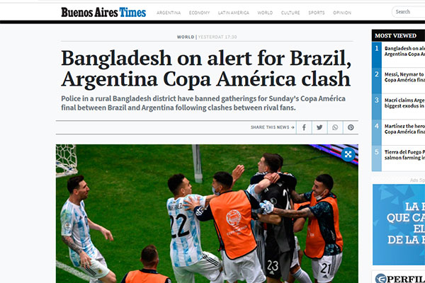 ওই সংঘর্ষের খবর প্রকাশিত হয়েছে আর্জেন্টিনার সংবাদমাধ্যম 'বুয়েন্স এইরেস টাইমস'-এ। সেই সংবাদের শিরোনাম দেওয়া হয়েছে, 'বাংলাদেশে কোপা আমেরিকা ঘিরে সংঘর্ষের ঘটনায় সতর্কতা জারি'।