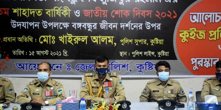 জাতির পিতা বঙ্গবন্ধু শেখ মুজিবুর রহমানের ৪৬তম শাহাদত বার্ষিকী ও জাতীয় শোক দিবস উপলক্ষে কুষ্টিয়ায় এসপি মোঃ খাইরুল আলমের উদ্যোগে বঙ্গবন্ধুর জীবন দর্শন এর উপর আলোচনা সভা, কুইজ প্রতিযোগিতা ও পুরুস্কার বিতরণ করা হয়েছে।