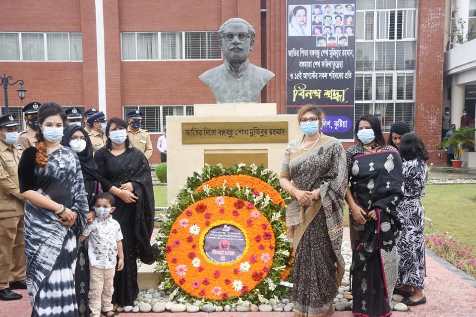 সর্বকালের সর্বশ্রেষ্ঠ বাঙ্গালী জাতির পিতা বঙ্গবন্ধু শেখ মুজিবুর রহমানের শাহাদত বার্ষিকী ও জাতীয় শোক দিবস উপলক্ষ্যে কুষ্টিয়া পুলিশ নারী কল্যান সমিতি (পুনাক) এর পক্ষ থেকে পুনাক সভানেত্রী মিসেস দিলরুবা আলম (সহধর্মিণী পুলিশ সুপার কুষ্টিয়া) বঙ্গবন্ধুর প্রতিকৃতিতে শ্রদ্ধা নিবেদন করেছেন।