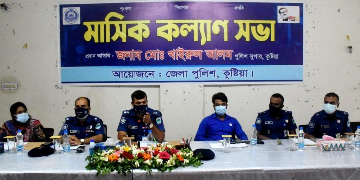 মঙ্গলবার (২৪ আগস্ট) সকাল ১১ টায় জেলা পুলিশ কুষ্টিয়ার আয়োজনে পুলিশ লাইন্স সম্মেলন কক্ষে স্বাস্থ্যবিধি মেনে মাসিক কল্যাণ সভা অনুষ্ঠিত হয়। মাসিক কল্যাণ সভায় প্রধান অতিথি হিসেবে উপস্থিত ছিলেন মোঃ খাইরুল আলম, পুলিশ সুপার কুষ্টিয়া। প্রধান অতিথি জেলা পুলিশ কুষ্টিয়ার সার্বিক কল্যাণে অফিসার – ফোর্সের আবেদন নিবেদন শ্রবণ করে কার্যকরী ব্যবস্থা গ্রহনের জন্য সংশ্লিষ্টদের নির্দেশ প্রদান করেন এবং বিভিন্ন দিক নির্দেশনা মূলক বক্তব্য রাখেন।