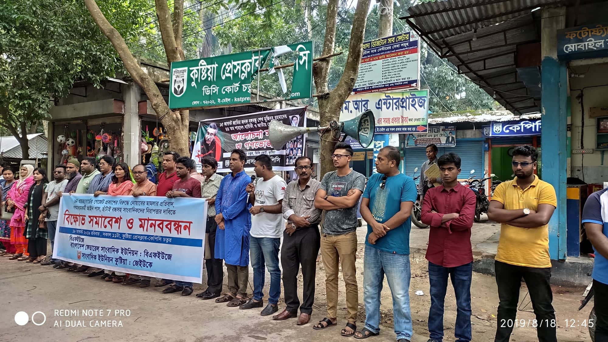 নিজস্ব প্রতিবেদক : নবম ওয়েজ বোর্ডের গেজেট প্রকাশের বিরুদ্ধে নোয়াবের মামলার প্রতিবাদ, গেজেট প্রকাশের দাবী ও গণমাধ্যমকর্মী আইন পাস এবং ছাটাই বন্ধসহ সাংবাদিকদের নিরাপত্তা দাবীতে কুষ্টিয়ায় মানববন্ধন ও বিক্ষোভ করেছে সাংবাদিক ইউনিয়ন। ফেডারেল সাংবাদিক ইউনিয়ন কেন্দ্র ঘোষিত কর্মসূচীর অংশ হিসেবে আজ রবিবার বেলা ১২ টায় কুষ্টিয়া প্রেসক্লাব-কেপিসির সামনে এ মানববন্ধন করেন সাংবাদিকরা। বক্তব্য রাখেন সাংবাদিক ইউনিয়ন কুষ্টিয়ার সভাপতি ও প্রেসক্লাব কেপিসির সভাপতি রাশেদুল ইসলাম বিপ্লব, সাংবাদিক ইউনিয়ন কুষ্টিয়ার ভারপ্রাপ্ত সাধারণ সম্পাদক মিলন উল্লাহ, কুষ্টিয়া প্রেসক্লাব কেপিসির যুগ্ম সাধারণ সম্পাদক শেখ হাসান বেলাল, সাংগঠনিক সম্পাদক সাবিনা ইয়াসমিন শ্যামলী, ফেডারেল সাংবাদিক ইউনিয়ন কেন্দ্রীয় কমিটির নির্বাহী সদস্য মাহমুদ হাসান, আফরোজা আক্তার ডিউ, মো : সালমান শাহেদ প্রমুখ।