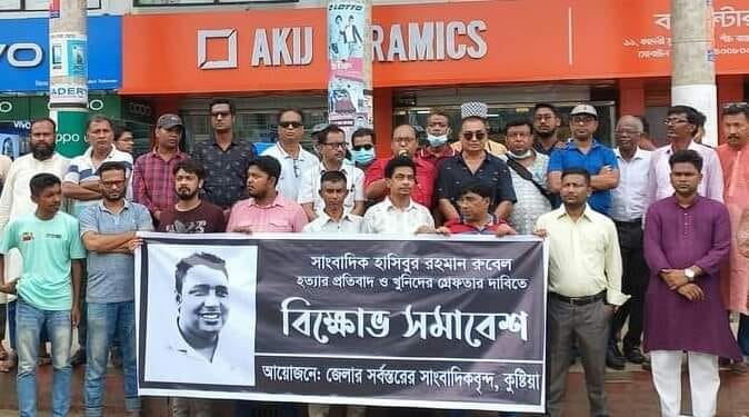 কুষ্টিয়ায় সাংবাদিক রুবেল হত্যার প্রতিবাদ ও জড়িত খুনিদের গ্রেফতার দাবিতে বিক্ষোভ সমাবেশ