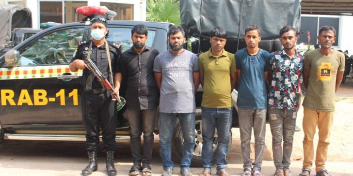 অভিযানে ডাকাত চক্রের সর্দারসহ ৬ সদস্যকে গ্রেফতার করেছে র্যাব সদস্যরা। এ সময় তাদের কাছ থেকে একটি বিদেশি পিস্তল, এক রাউন্ড গুলি, একটি ছোরা, একটি রামদা, একটি চাইনিজ কুড়াল, দুটি তালা ভাঙ্গার কাটার ও শাবল উদ্ধার করা হয়। গ্রেফতারকৃতরা হলেন- ডাকাত সর্দার সাখাওয়াত হোসেন রনি (২৫), মো. সোহেল (৩২), মো. শহিদুল ইসলাম (২৬), আল আমিন (২৩), মো. ইসমাইল (৩৮) ও সুজয় দে (৩০)।