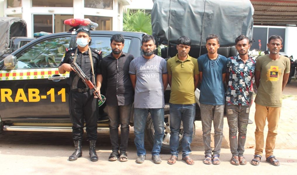 অভিযানে ডাকাত চক্রের সর্দারসহ ৬ সদস্যকে গ্রেফতার করেছে র্যাব সদস্যরা। এ সময় তাদের কাছ থেকে একটি বিদেশি পিস্তল, এক রাউন্ড গুলি, একটি ছোরা, একটি রামদা, একটি চাইনিজ কুড়াল, দুটি তালা ভাঙ্গার কাটার ও শাবল উদ্ধার করা হয়। গ্রেফতারকৃতরা হলেন- ডাকাত সর্দার সাখাওয়াত হোসেন রনি (২৫), মো. সোহেল (৩২), মো. শহিদুল ইসলাম (২৬), আল আমিন (২৩), মো. ইসমাইল (৩৮) ও সুজয় দে (৩০)।