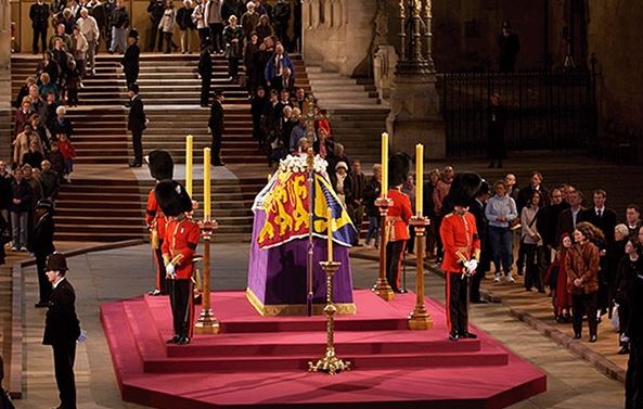 বাকিংহাম প্যালেসে রাজা চার্লস তৃতীয় এবং তার স্ত্রী কুইন কনসোর্ট ক্যামিলা কফিন গ্রহণ করবেন। বুধবার রানির মরদেহ বাকিংহাম প্যালেস থেকে ওয়েস্টমিনস্টার হলে নিয়ে যাওয়া হবে। সেখানে কফিনটিকে একটি উঁচু প্ল্যাটফর্মে রাখা হবে। কফিনটি রাজকীয় পতাকায় মোড়ানো হবে এবং তার ওপর মুকুট, রাজকীয় প্রতীক এবং রাজদণ্ড রাখা হবে। সাধারণ মানুষ তখন রানিকে সার বেধে শ্রদ্ধা জানাতে পারবেন।