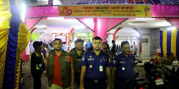 জেলা পুলিশ কুষ্টিয়ার পক্ষ থেকে শারদীয় দুর্গোৎসব উদযাপনের দিনগুলোর নিরাপত্তা নিশ্চিত করতে প্রতিটি মণ্ডপে ১জন করে ইউনিফর্মধারী পুলিশ মোতায়েন করা হয়। তাছাড়াও কুষ্টিয়া জেলায় ৭৯টি পুলিশের মোবাইল টিম, ৭ থানার জন্য ডিবি’র ৭ টি মোবাইল টিম, সাদা পোশাকি পুলিশ সহ সর্বমোট ৭৪১ পুলিশ সদস্য দায়িত্ব পালন করে। এছাড়াও প্রতিদিন কুষ্টিয়া জেলার সকল থানার অফিসার ইনচার্জ বৃন্দ, সার্কেলের সহকারি পুলিশ সুপার, অতিরিক্ত পুলিশ সুপারবৃন্দ কর্তৃক বিভিন্ন পূজা মন্ডপ ভিজিট করার মাধ্যমে আইন শৃঙ্খলা ঠিক রাখাসহ নিরাপত্তা নিশ্চিত করা হয়।