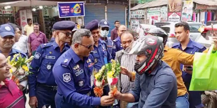 ট্রাফিক আইন মেনে চলুন, হেলমেট পড়ুন নিজের জীবনকে রক্ষা করুন’ এ বিষয়কে ধারণ করে বুধবার দিনব্যাপী ট্রাফিক সচেতনতামূলক কর্মসূচিতে পুলিশ সুপার মাহাফুজ্জামান আশরাফ নিজেই ফুল ও চকলেট বিতরণ করেন।