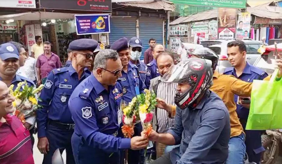ট্রাফিক আইন মেনে চলুন, হেলমেট পড়ুন নিজের জীবনকে রক্ষা করুন’ এ বিষয়কে ধারণ করে বুধবার দিনব্যাপী ট্রাফিক সচেতনতামূলক কর্মসূচিতে পুলিশ সুপার মাহাফুজ্জামান আশরাফ নিজেই ফুল ও চকলেট বিতরণ করেন।