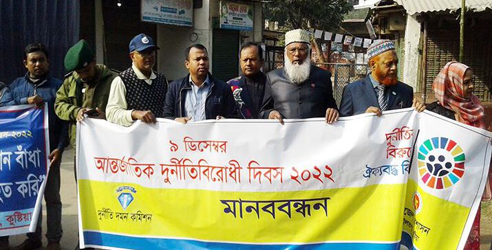 দূর্নীতির বিরুদ্ধে ঐক্যবদ্ধ বিশ্ব স্লোগানে সারা দেশের ন্যায় কুষ্টিয়াতেও আন্তর্জাতিক দুর্নীতিবিরোধী দিবস পালিত হয়েছে। এ উপলক্ষ্যে শুক্রবার (৯ ডিসেম্বর) সকাল সাড়ে ৯টায় কুষ্টিয়া দুর্নীতি দমন কমিশন, কুষ্টিয়া জেলা প্রশাসন ও দুর্নীতি প্রতিরোধ কমিটির আয়োজনে বর্ণাঢ্য শোভাযাত্রা বের হয়।