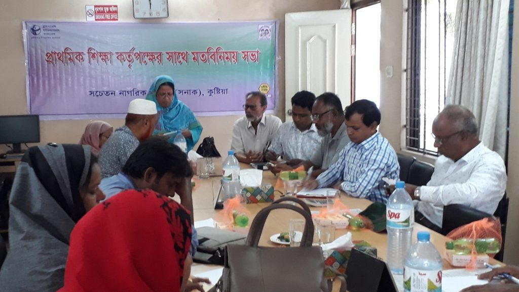 কুষ্টিয়া সদর উপজেলা প্রাথমিক শিক্ষা কর্তৃপক্ষের সাথে সচেতন নাগরিক কমিটি (সনাক), কুষ্টিয়ার এক মতবিনিময় সভায় প্রধান অতিথি হিসেবে উপজেলা প্রাথমিক শিক্ষা অফিসার সাইদা সিদ্দিকা বলেন, ইতোমধ্যে সদর উপজেলার শতভাগ সরকারি প্রাথমিক বিদ্যালয়ে একটিভ মাদারস ফোরাম গঠন করা হয়েছে; বিদ্যালয় ও শিক্ষা সংশ্লিষ্ট সকল কার্যে স্বচ্ছতা, জবাবদিহিতা নিশ্চিতের জন্য প্রয়োজনীয় পদক্ষেপ গ্রহণ হরা হচ্ছে। সোমবার সকালে সনাক অফিস কক্ষে অনুষ্ঠিত সভায় তিনি বলেন, প্রাথমিক শিক্ষার মানোন্নয়নে শিক্ষা কর্তৃপক্ষ তথা শিক্ষকবৃন্দ, শিক্ষা অধিদপ্তরের কর্মীবৃন্দর পাশাপাশি অভিভাবক বিশেষত মায়েদের সচেতনতা খুবই গুরুত্বপূর্ণ।