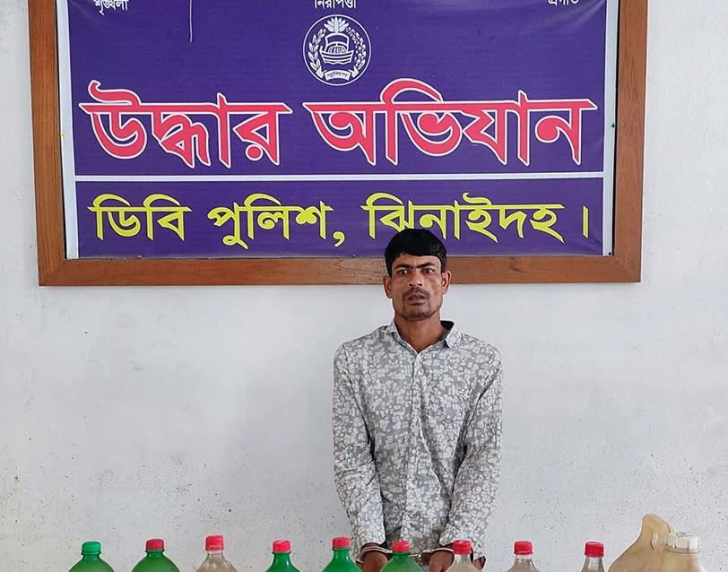 ঝিনাইদহে ৪০ লিটার দেশীয় চোলাই মদসহ শুপলাভ বিশ্বাস নামের এক বিক্রেতাকে আটক করেছে জেলা গোয়েন্দা পুলিশ। শনিবার সকালে সদর উপজেলার ভূপতিপুর এলাকা থেকে তাকে আটক করা হয়। আটককৃত শুপলাভ বিশ্বাস সদর উপজেলার হাটগোপালপুর লোহাজাঙ্গা গ্রামের সুশান্ত বিশ্বাসের ছেলে।