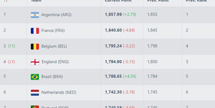 ৪ এপ্রিল, বৃহস্পতিবার হালনাগাদকৃত ব্যাংকিং প্রকাশ করেছে ফুটবলের সর্বোচ্চ নিয়ন্ত্রক সংস্থা ফিফা। তালিকায় সেরা দশে দুটি জায়গায় পরিবর্তন এসেছে। আর্জেন্টিনার পর ১৮৪০.৬০ পয়েন্ট নিয়ে ২য় স্থানে আছে ফ্রান্স। ইংল্যান্ডকে টপকে ১৭৯৫.২৪ পয়েন্ট নিয়ে তিনে উঠে এসেছে বেলজিয়াম।