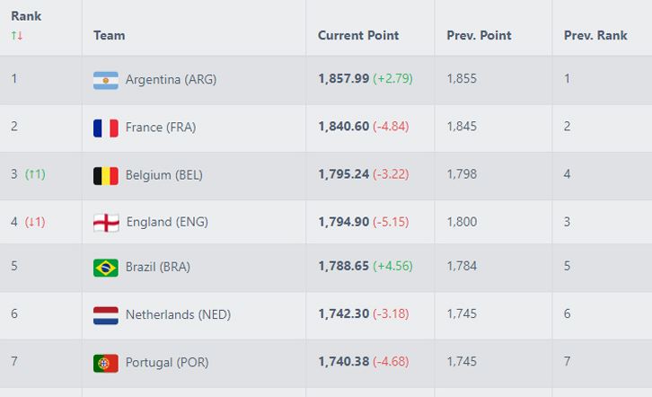 বরাবরের ন্যায় ১৮৫৭.৯৯ পয়েন্ট নিয়ে টানা একবছর ধরে শীর্ষস্থান ধরে রেখেছে আর্জেন্টিনা। এদিকে, র্যাংকিংয়ে এক ধাপ পিছিয়েছে বাংলাদেশ।