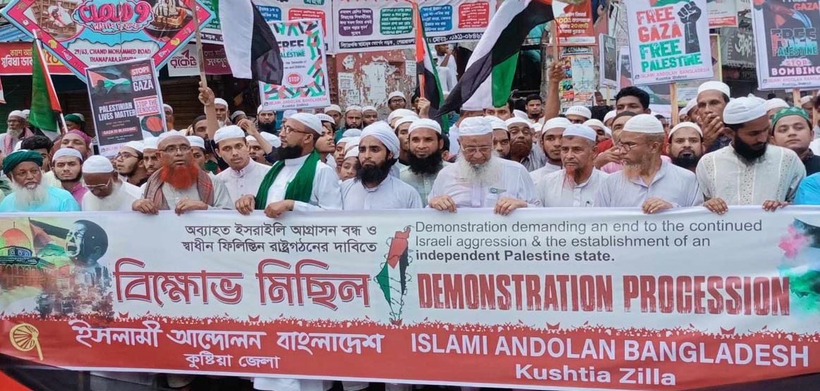 ফিলিস্তিনে ইসরায়েলি আগ্রাসন বন্ধ ও স্বাধীন ফিলিস্তিন রাষ্ট্র প্রতিষ্ঠার দাবিতে কুষ্টিয়ায় বিক্ষোভ মিছিল করেছে ইসলামী আন্দোলন বাংলাদেশ।