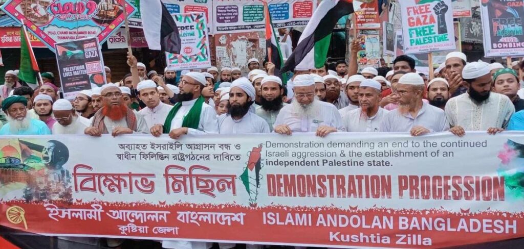 ফিলিস্তিনে ইসরায়েলি আগ্রাসন বন্ধ ও স্বাধীন ফিলিস্তিন রাষ্ট্র প্রতিষ্ঠার দাবিতে কুষ্টিয়ায় বিক্ষোভ মিছিল করেছে ইসলামী আন্দোলন বাংলাদেশ।