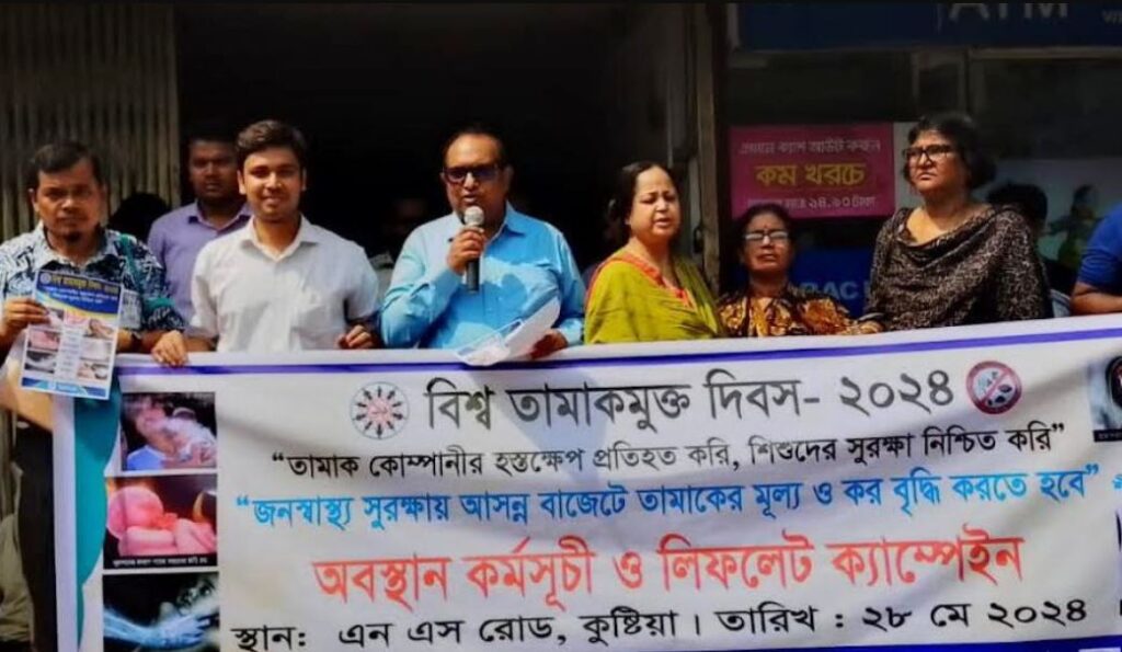 তামাক কোম্পানীর হস্তক্ষেপ প্রতিহত করি, শিশুদের সুরক্ষা নিশ্চিত করি এই প্রতিপাদ্যকে সামনে রেখে, জনস্বাস্থ্য উন্নয়নে আসন্ন বাজেটে তামাকের মূল্য ও কর বৃদ্ধির দাবিতে কুষ্টিয়ায় বিশ্ব তামাকমুক্ত দিবস পালিত হয়েছে।