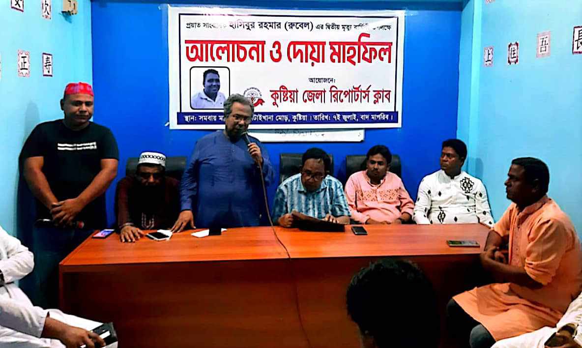 রোববার (৭ জুলাই) সন্ধ্যায় বাদ মাগরিব কুষ্টিয়া কাটাইখানা মোড়ের সমবায় মার্কেট-৩ এর দ্বিতীয় তলায় কুষ্টিয়া জেলা রিপোর্টার্স ক্লাবের আয়োজনে প্রয়াত সাংবাদিক হাসিবুর রহমান রুবেলের দ্বিতীয় মৃত্যুবার্ষিকী উপলক্ষে আলোচনা সভা ও দোয়া মাহফিল অনুষ্ঠানে সাংবাদিক নেতারা এসব কথা বলেন।