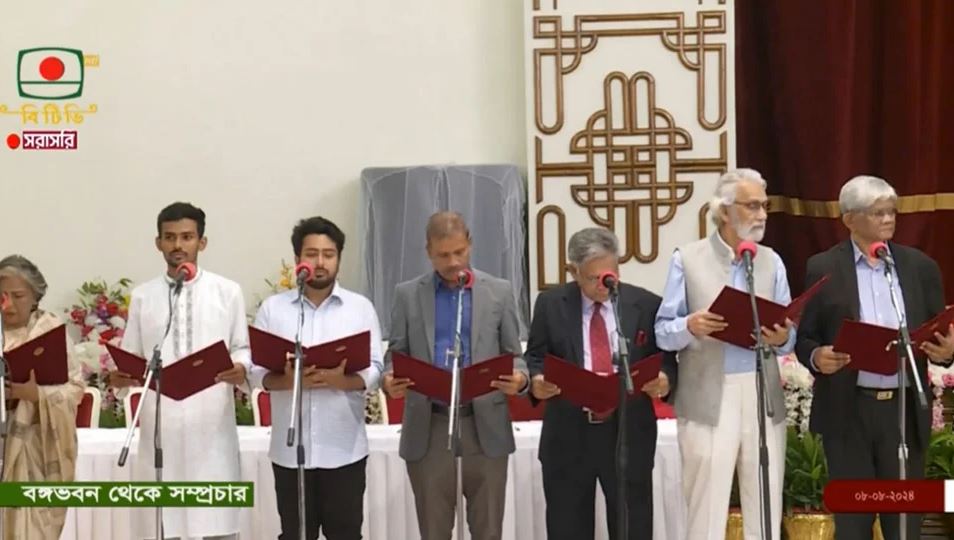 তবে তিনজন উপদেষ্টা ঢাকার বাইরে অবস্থান করায় শপথগ্রহণ অনুষ্ঠানে আসতে পারেননি। তারা হলেন ফারুক-ই-আজম (বীর প্রতীক), সুপ্রদীপ চাকমা ও বিধান রঞ্জন রায়। এদিকে, শপথ অনুষ্ঠানের শুরুতে কোটা আন্দোলনে নিহত শহীদদের স্মরণে এক মিনিট নীরবতা পালন করা হয়। শপথ অনুষ্ঠান সঞ্চালনা করেন মন্ত্রিপরিষদ সচিব মাহবুব হোসেন।