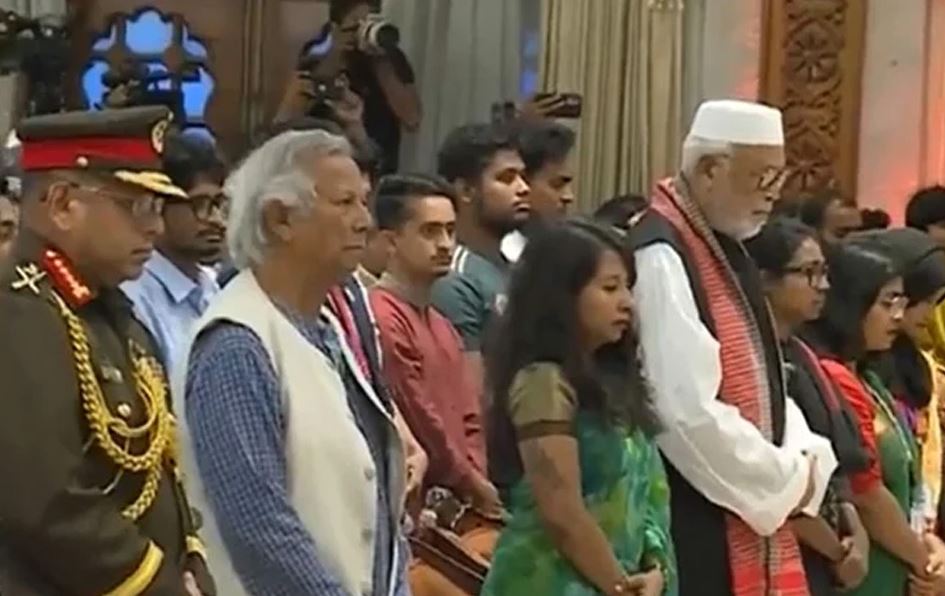 অন্তর্বর্তীকালীন সরকারের প্রধান উপদেষ্টা ও উপদেষ্ঠাদের শপথ অনুষ্ঠানে কোটা বিরোধী আন্দোলনে নিহত শহীদের স্মরণে এক মিনিট নীরবতা পালন করা হয়েছে।