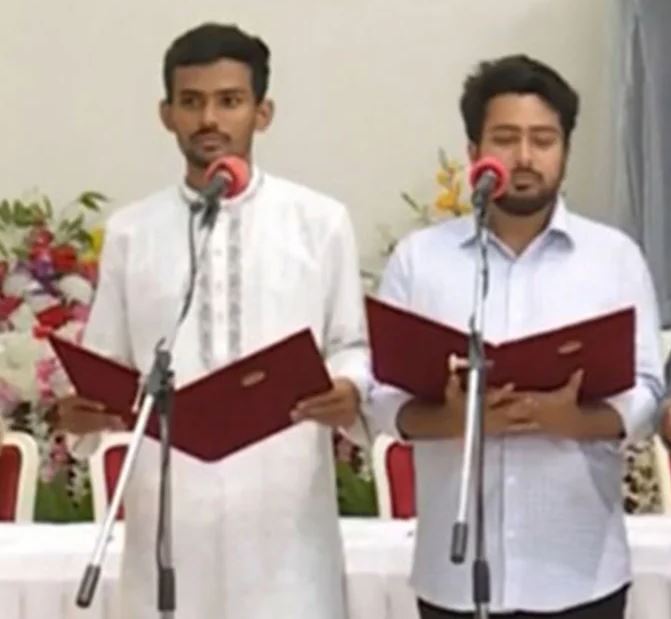 অন্তর্বর্তী সরকারের উপদেষ্টা হলেন বৈষম্যবিরোধী ছাত্র আন্দোলনের দুই সমন্বয়ক মো. নাহিদ ইসলাম ও আসিফ মাহমুদ সজীব ভূঁইয়া। তারা দু’জনই ঢাকা বিশ্ববিদ্যালয়ের শিক্ষার্থী।