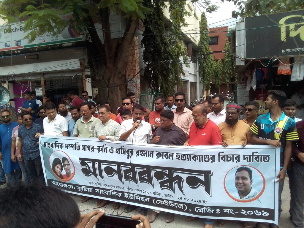 সাংবাদিক দম্পতি সাগর-রুনি ও হাসিবুর রহমান রুবেল হত্যাকাণ্ডের বিচারের দাবিতে মানববন্ধন করেছে কুষ্টিয়া সাংবাদিক ইউনিয়ন (কেইউজে)।
