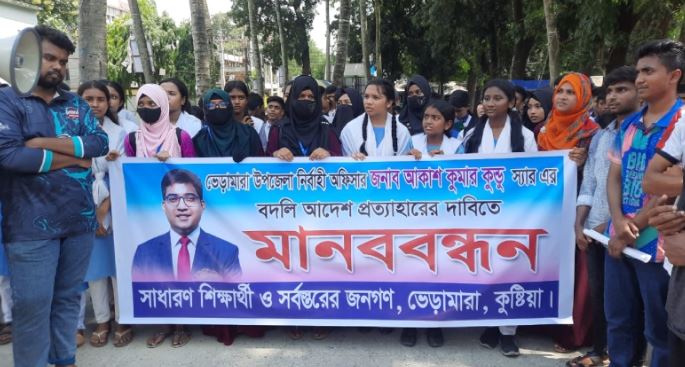 কুষ্টিয়ার ভেড়ামারা উপজেলা নির্বাহী কর্মকর্তার (ইউএনও) বদলির আদেশ প্রত্যাহারের দাবিতে মানববন্ধন ও বিক্ষোভ করেছেন শিক্ষার্থীরা।