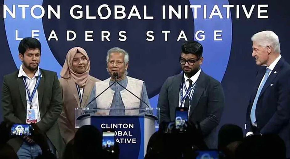 এসময় ড. ইউনূস বলেন, ‘তারা যেভাবে কথা বলেন এমন কথা আমি কখনো শুনিনি। তারা নতুন পৃথিবী, নতুন বাংলাদেশ গড়তে প্রস্তুত। প্লিজ আপনারা তাদের হেল্প করবেন। যেন তারা তাদের স্বপ্ন পূরণ করতে পারেন। এ গুরুদায়িত্ব আমাদের সবার নিতে হবে।’ এ সময় তিনি বিল ক্লিনটনের হাত ধরে বলেন, ‘আপনি আমাদের সঙ্গে আছেন এ স্বপ্ন পূরণে।’