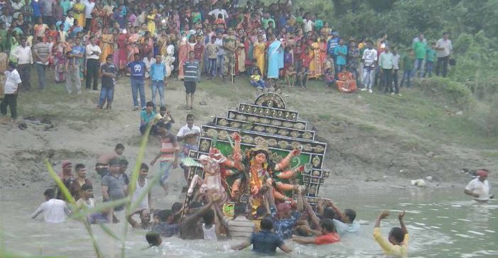 ওপারে ভারতের পশ্চিমবঙ্গের নদীয়া জেলার শিকারপুর সীমান্ত আর এপারে বাংলাদেশের কুষ্টিয়া জেলার দৌলতপুর উপজেলার ধর্মদহ সীমান্ত। মাঝখানের সরু মাথাভাঙ্গা নদী তার সীমানা। এ নদীর দুইপাড়ে দুর্গোৎসবের পূজা বিসর্জনে কাঁটাতারের সীমানা বিভেদ ভুলে দুই দেশের মানুষের মধ্যে কিছু সময়ের জন্য ঘটেছিল আনন্দ ও সোহার্দপূর্ণ মিলন। দেবী দূর্গাকে বিসর্জন দিতে এসে দুই পারের মানুষ সাঁতরিয়ে নদী পারাপার হয়ে সোহার্দ ও বন্ধনকে করেছে অটুট। সেই সাথে করেছে একে অপরকে মিষ্টি মুখ। তাদের মধ্যে হয়েছে কুশল বিনিময়। অশ্রু সজল নয়নে আত্মীয় স্বজনরা একে অপরকে বেঁধেছে মমতার বন্ধনে।