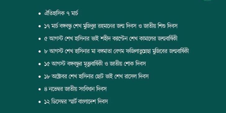 দিবসগুলো হলো- ঐতিহাসিক ৭ মার্চ, ১৭ মার্চ বঙ্গবন্ধু শেখ মুজিবুর রহমানের জন্ম দিবস ও জাতীয় শিশু দিবস, ৫ আগস্ট শেখ হাসিনার ভাই শহীদ ক্যাপ্টেন শেখ কামালের জন্মবার্ষিকী, ৮ আগস্ট শেখ হাসিনার মা বঙ্গমাতা বেগম ফজিলাতুন্নেছা মুজিবের জন্মবার্ষিকী, ১৫ আগস্ট বঙ্গবন্ধুর মৃত্যুবার্ষিকী ও জাতীয় শোক দিবস, ১৮ অক্টোবর শেখ হাসিনার ছোট ভাই শেখ রাসেল দিবস, ৪ নভেম্বর জাতীয় সংবিধান দিবস এবং ১২ ডিসেম্বর স্মার্ট বাংলাদেশ দিবস।