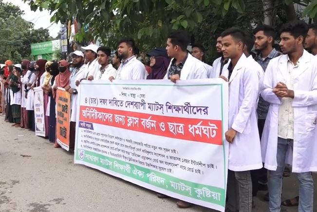 চার দফা দাবি আদায়ে কুষ্টিয়ায় মানববন্ধন ও সড়ক অবরোধ কর্মসূচি পালন করেছে বাংলাদেশ মেডিকেল অ্যাসিস্ট্যান্ট স্কুল ম্যাটসের শিক্ষার্থীরা।