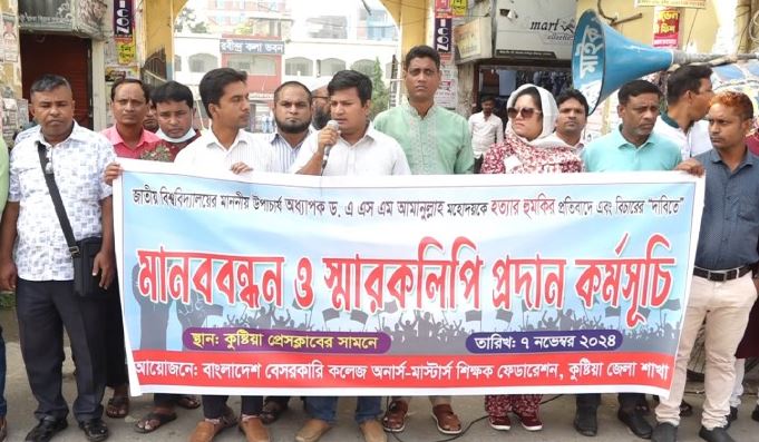 ৭ নভেম্বর, বৃহস্পতিবার বেলা ১১ টায় বাংলাদেশ বেসরকারি কলেজ অনার্স-মাস্টার্স শিক্ষক ফেডারেশন কুষ্টিয়া জেলা শাখার ব্যানারে এ মানববন্ধন অনুষ্ঠিত হয়।
