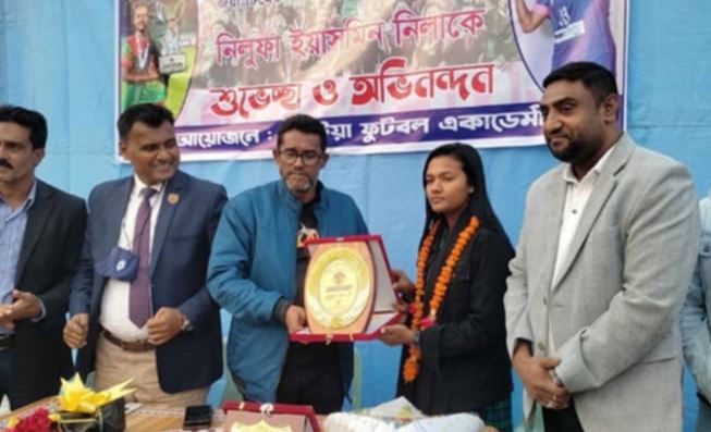 নেপালকে হারিয়ে টানা দ্বিতীয়বারের মতো সাফ নারী চ্যাম্পিয়ন হয়েছে বাংলাদেশ। চ্যাম্পিয়ন দলের অন্যতম সদস্য নিলুফা ইয়াসমিন নীলা। এবার তার নিজ জেলা কুষ্টিয়া ফুটবল একাডেমির পক্ষ থেকে তাকে সংবর্ধনা দেওয়া হয়েছে।