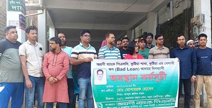 খেলাপি ঋণ আদায়ে ব্যতিক্রমী উদ্যোগ গ্রহণ করেছেন কুষ্টিয়ায় কর্মরত অগ্রণী ব্যাংকের কর্মকর্তা-কর্মচারীরা। খেলাপি ঋণ আদায়ে সামাজিকভাবে চাপ প্রয়োগের উদ্দেশ্যে তারা ঋণগ্রহীতার বাড়ির সামনে অবস্থান কর্মসূচির উদ্যোগ নিয়েছেন।