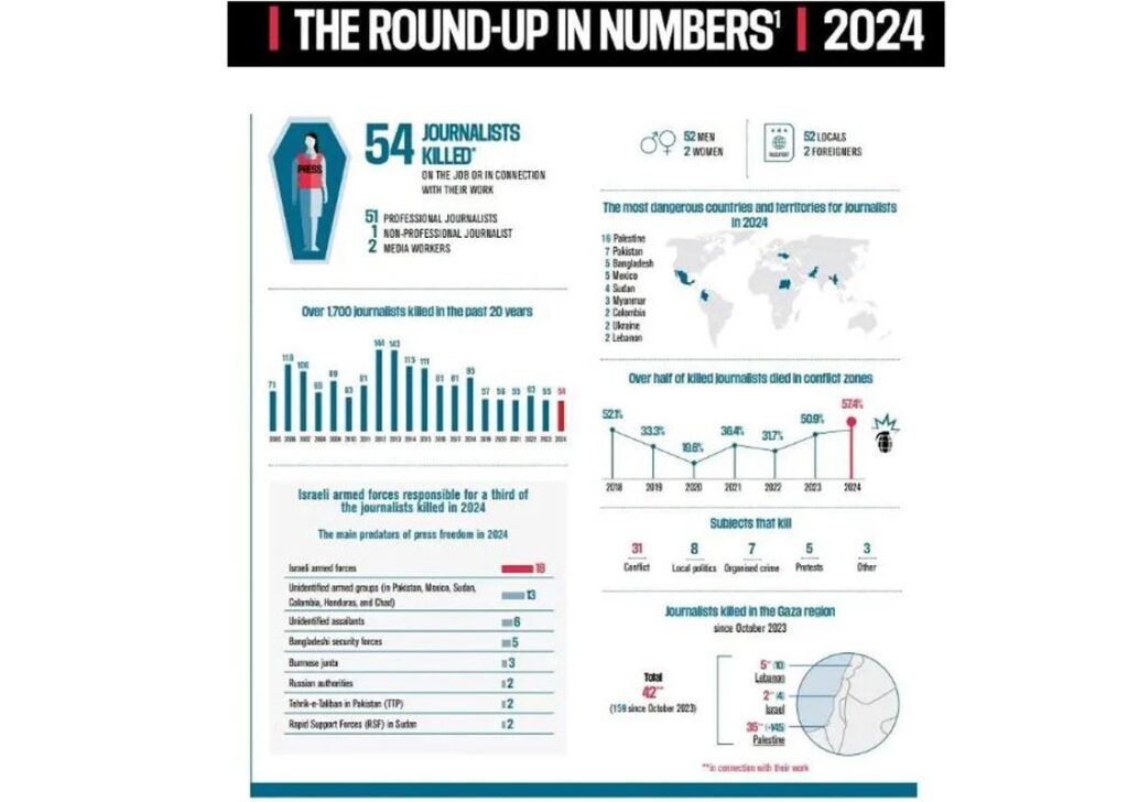 ‘২০২৪ রাউন্ড আপ’ শীর্ষক প্রতিবেদনে জানানো হয়, এ বছর পেশাগত দায়িত্ব পালন করতে গিয়ে রেকর্ড ৫৪ জন সাংবাদিক হত্যার শিকার হয়েছেন। এর মধ্যে ৩১ জনের মৃত্যু হয়েছে যুদ্ধ বা সহিংসতা চলছে এমন এলাকায়। বিশেষ করে ইরাক, সুদান, মিয়ানমার, ইউক্রেন ও গাজার যুদ্ধক্ষেত্রও রয়েছে। গত পাঁচ বছরের মধ্যে এরকম এলাকায় সাংবাদিকদের নিহতের সংখ্যা এবারই সর্বোচ্চ (৫৭ দশমিক ৪ শতাংশ)।